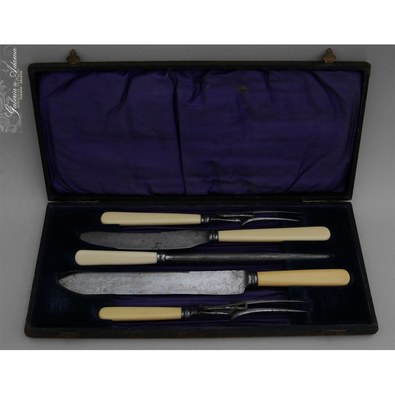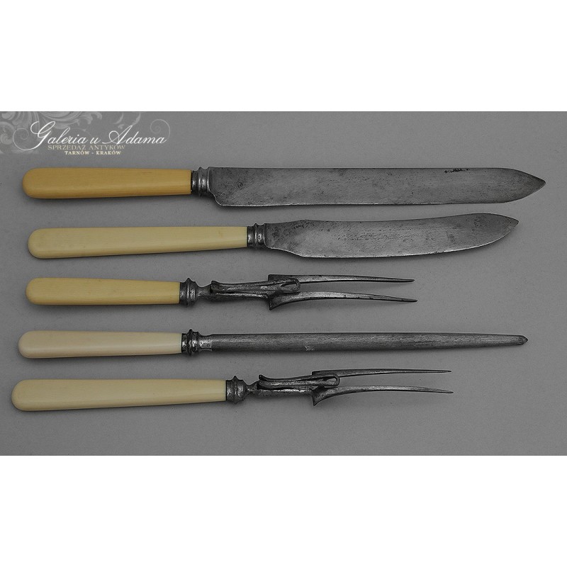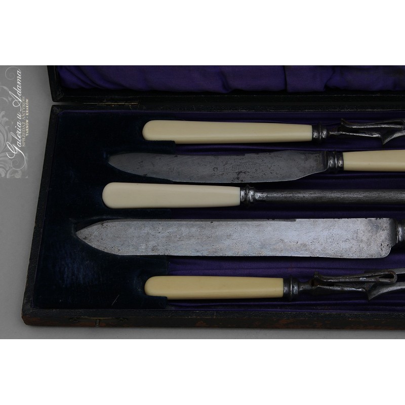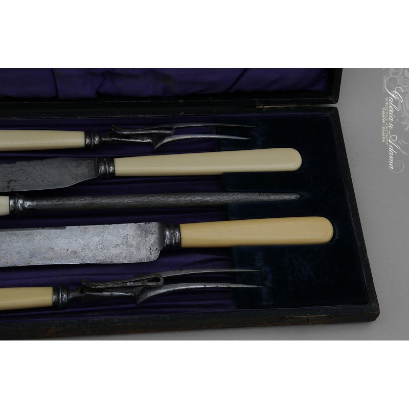 Dodatkowy opis:. Oryginalny okazały komplet myśliwski znanej manufaktury – SHEFFIELD. Składający się z dwóch dużych noży do mięs, dwóch widelców i ostrzałki. Sztućce z wysokiej jakości stali (bardzo ostre), rączki wykonane z kości . Komplet w oryginalnie zachowanym etui. CAŁOŚĆ BARDZO PIĘKNA !