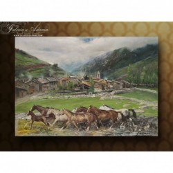 OBRAZ OLEJNY - Alfredo Palmero de Gregorio (nazywany Maestro Palmero) - GÓRSKI PEJZAŻ Z GALOPUJĄCYM STADEM KONI.
