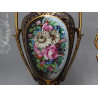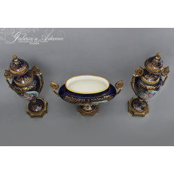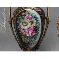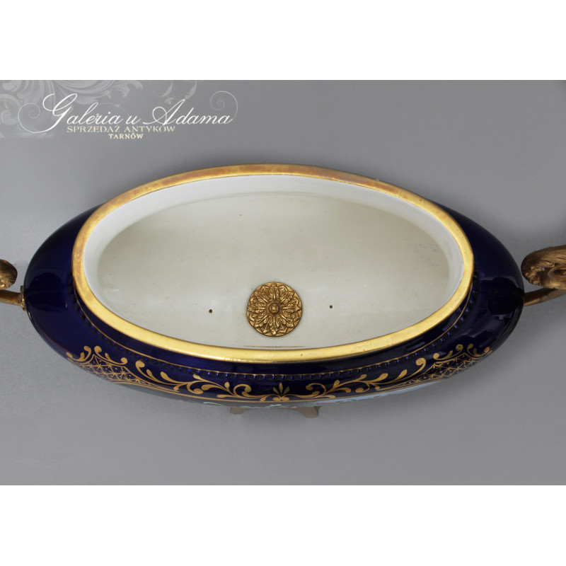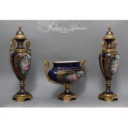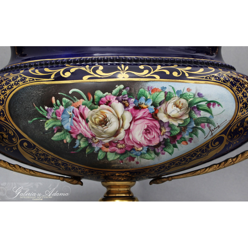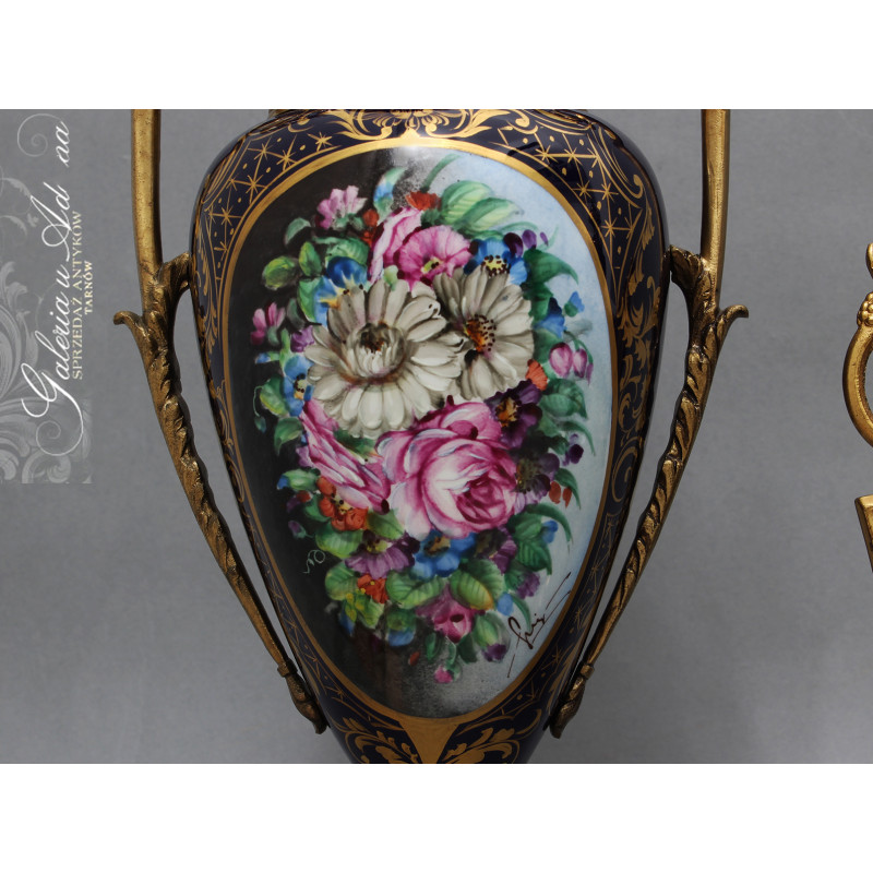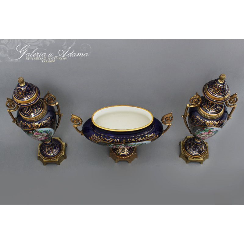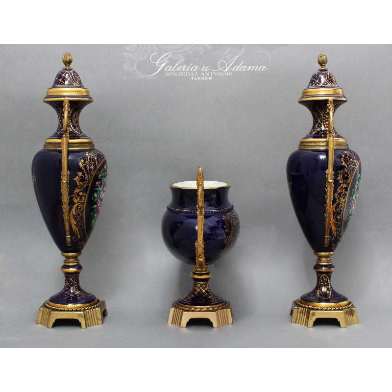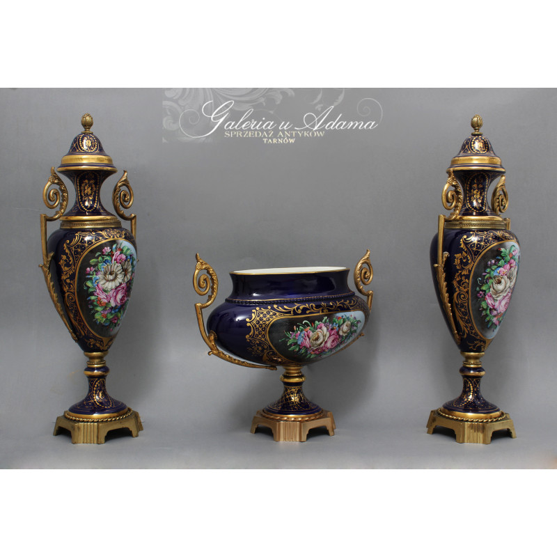 Dodatkowy opis: piękny porcelanowy zestaw 3 pałacowych waz, ręcznie malowane i złocone. Smukła, klasyczna forma z mosiężnymi uchwytami i podstawami. Kolorystyka królewskiego kobaltu z elementami złoceń i dekoracjami o pięknej tematyce kwiatów i wici roślinnej ręcznie malowanymi, sygnowane. Piękne !