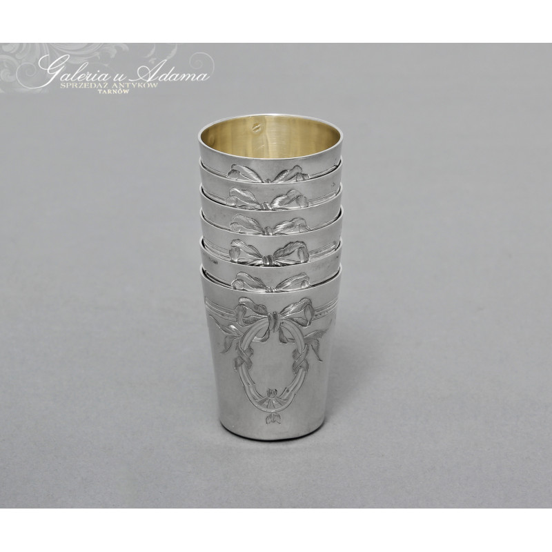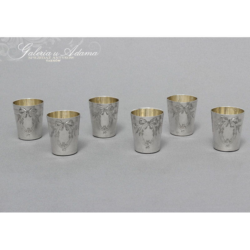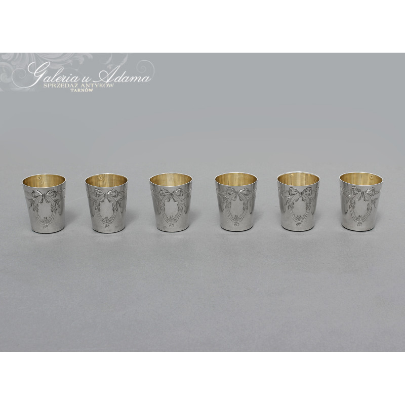 Komplet kieliszków (6 szt) ze srebra próby-950 wewnątrz złocony, zdobiony eleganckimi grawerami.