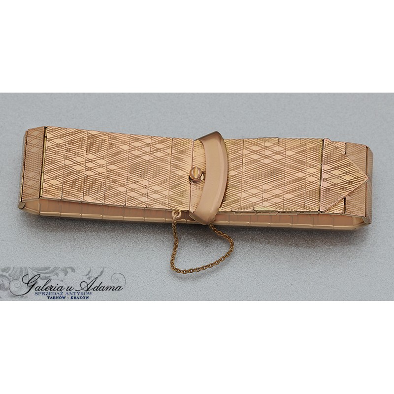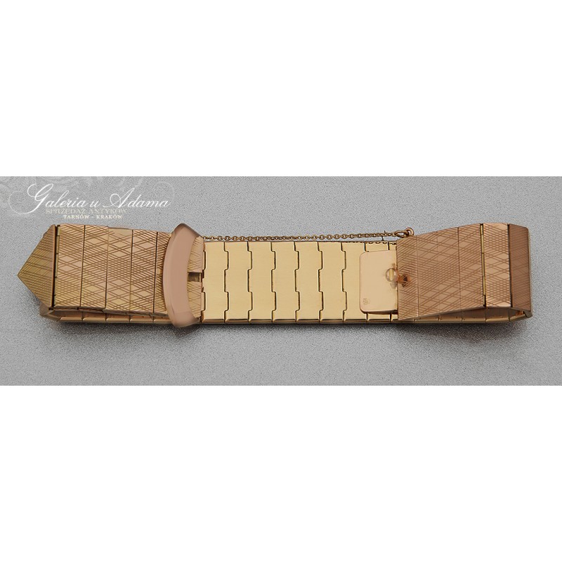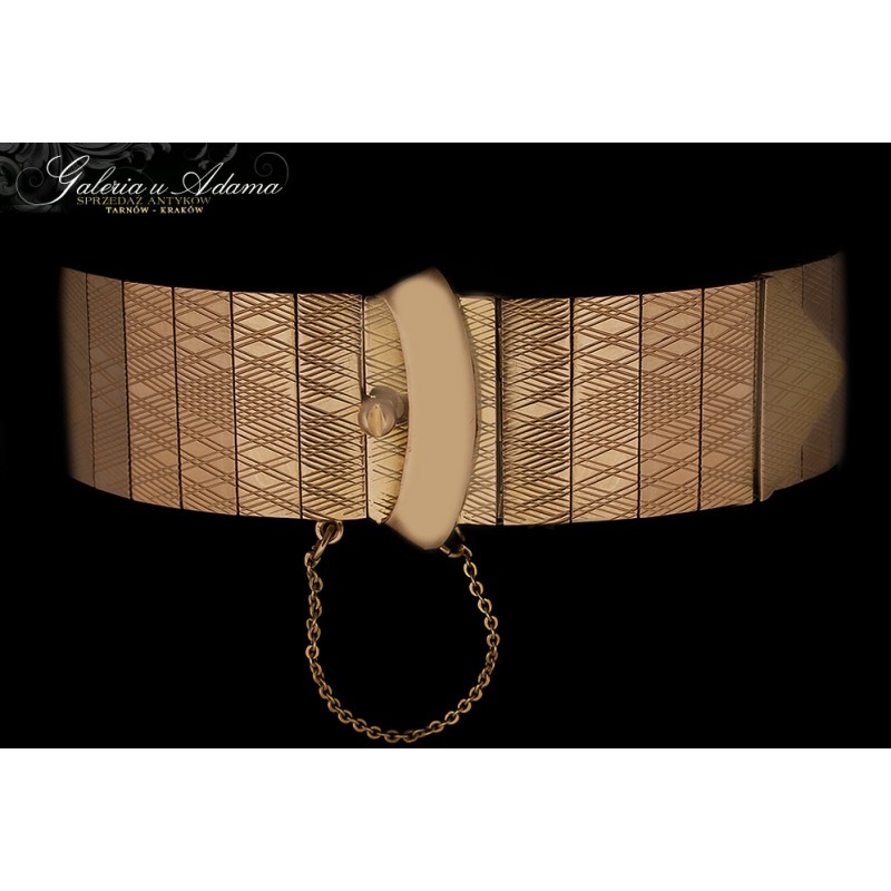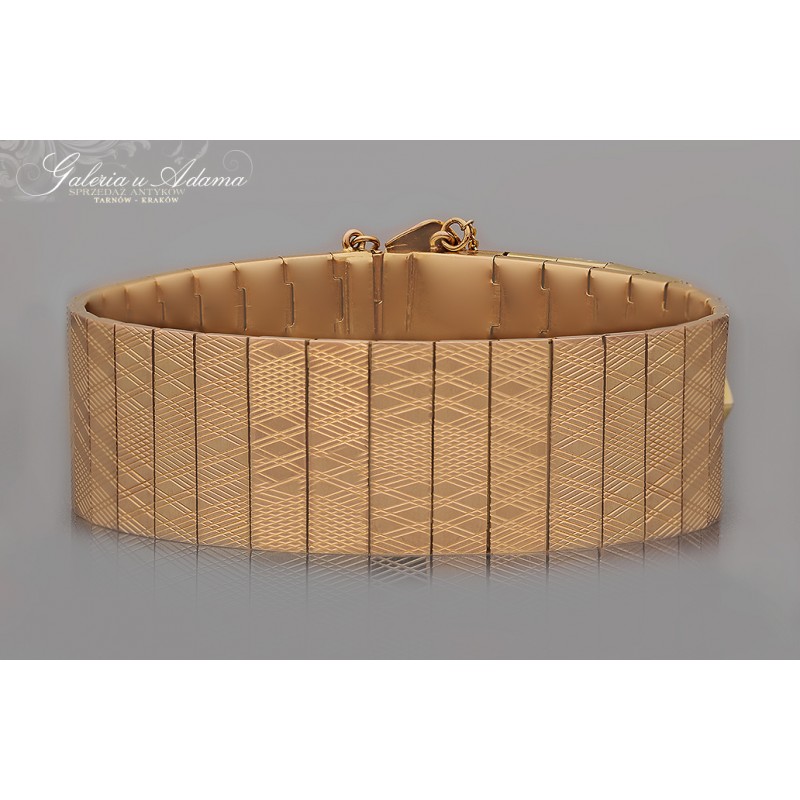 Dodatkowy opis; solidna bransoletka wykonana w całości ze złota próby-18 karat z zapięciem w formie klamerki paseczka. Wszystkie elementy w bransolecie są ruchome, co korzystnie wpływa na wygodę w noszeniu. Całość pokryta misternym grawerunkiem. PIĘKNA I WYGODNA !
